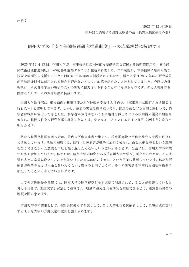 - 声明 信州大学の「安全保障技術研究推進制度」への応募解禁に抗議するPDF 長野反核医療者の会は、下記の声明を発表しました。 信州大学の「安全保障技術研究推進制度」への応募解禁に抗議する 2025年… 続きを読む: 声明 信州大学の「安全保障技術研究推進制度」への応募解禁に抗議する