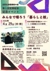 長野反核医療者の会 第5回定期総会 記念イベント みんなで喋ろう「暮らしと核」 日時:2026年4月29日(水・休) 13:00〜16:30 会場:松本市勤労者福祉センター 3-3会議室 zoom併用 ゲスト:永井玲衣さ […]